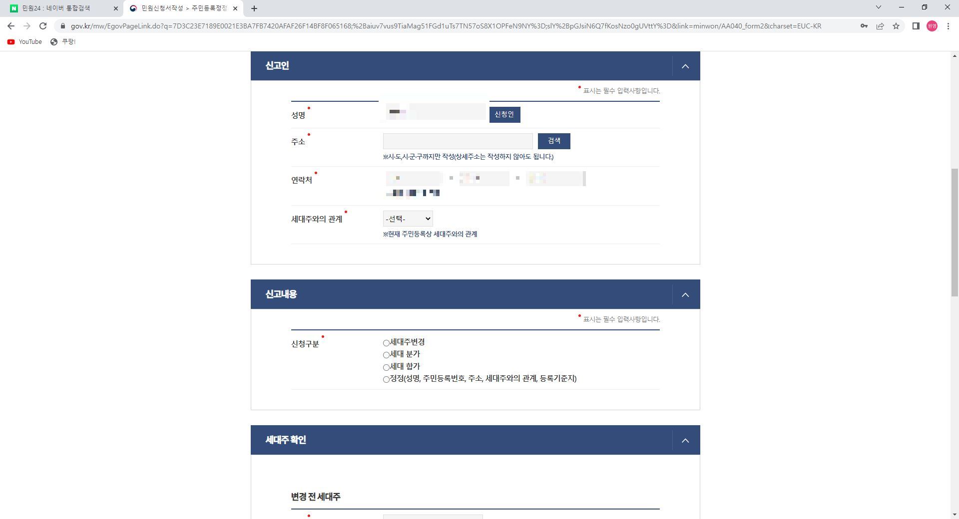민원24에서 세대주변경을 신청했으면