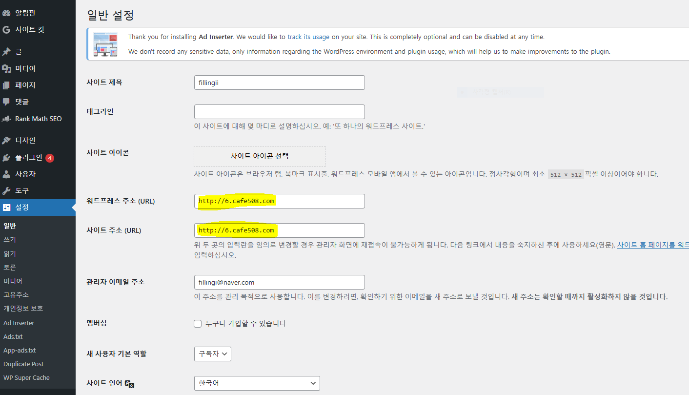 기본 주소로 워드프레스 주소가 되어있었는데